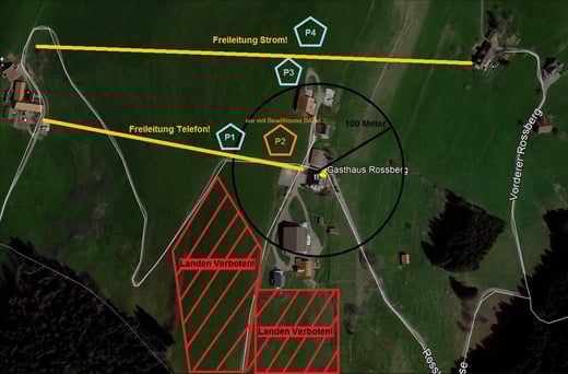 Bitte melden Sie sich telefonisch an, damit wir Ihnen sagen können welche Landezone anzufliegen ist. Pro Landung fällt eine Gebühr von Fr. 10.00 an, die vollumfänglich den Landbesitzern weiter gegeben wird. Herzlichen Dank für Ihr Verständnis.
